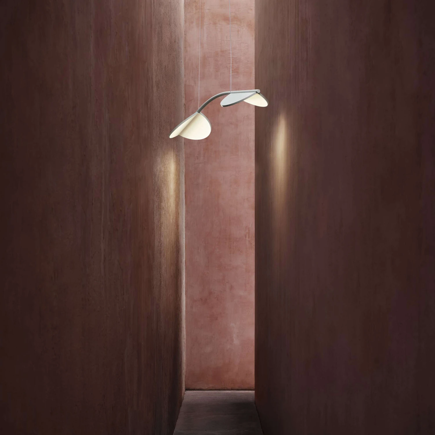 LED pendant lamp Almendra Arch with two lighting elements LED pendant lamp Almendra Arch is composed of a filigree, slightly bent rod and two light sources located at the ends of the frame. They are designed to resemble opened almond shells and each can be rotated by 60°. Thus, it is possible to direct the warm light in the desired direction. For example, the pendant luminaire is ideal for lighting the living room or dining room table. However, it can also be used in public areas, such as restaurant or hotels. In addition, with an external dimming system (1-10V, DALI, push dim, potentiometer), the brightness of the light can be regulated to individual needs.Almendra series was created by designer and architect Patricia Urquiola. In her work, the issue of sustainability plays a major role, so for Almendra a special, sustainable plastic was used and the use of glue was abandoned. The lamp can thus be disassembled later and the individual elements can be recycled according to their material.