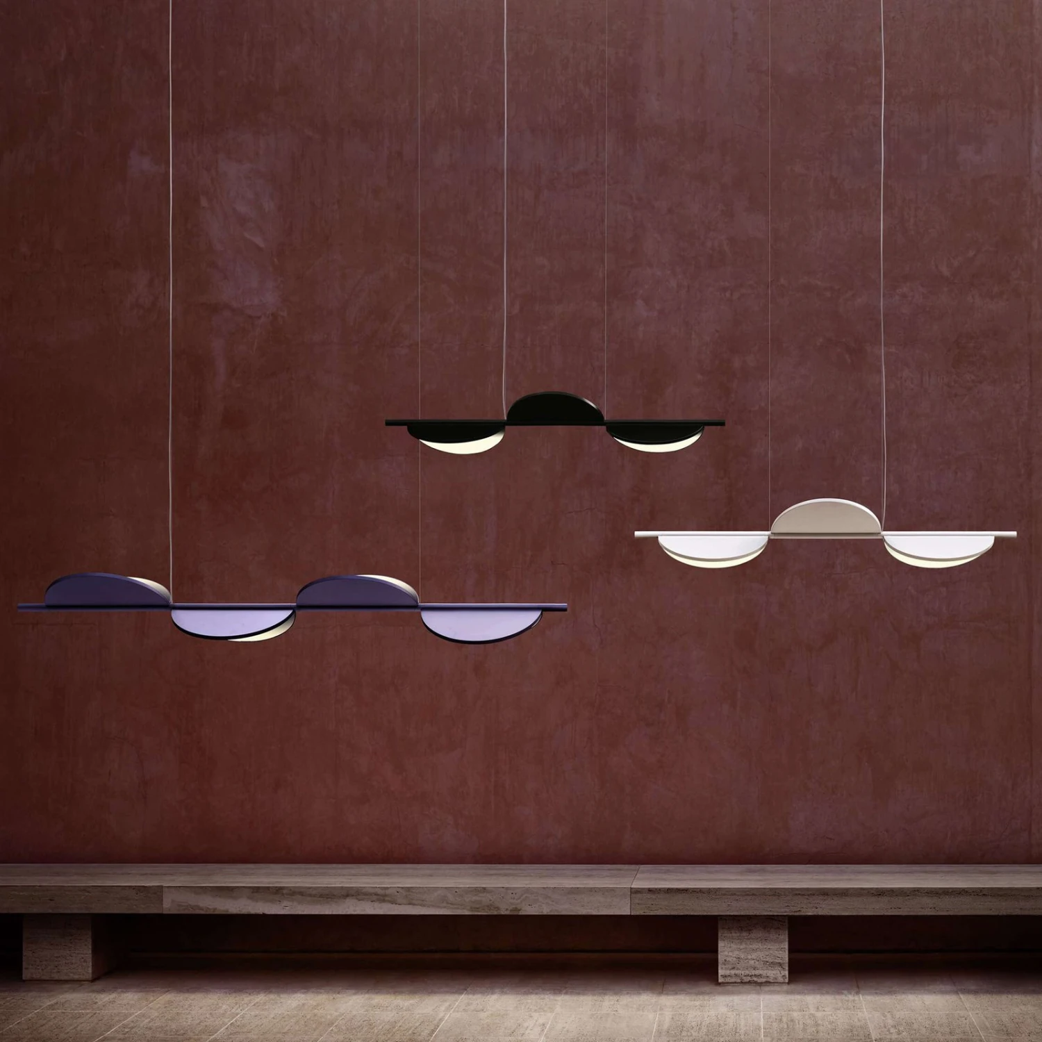 Three-flame LED pendant lamp Almendra Linear with rotating light fixtures The shape of the LED pendant lamp Almendra Linear is intended to resemble the shells of an open almond, which are connected by a narrow tubular structure. From there, the pleasantly warm light is radiated into the room and emerges evenly. The pendant lamp is made of aluminum and is suitable, for example, for lighting the living room or dining room table. It is possible to rotate the individual modules by 60° to change the direction of light emission. In addition, the brightness can be regulated with an external dimming system (1-10V, DALI, push dim, potentiometer). The hanging lamp was designed by the Spanish designer Patricia Urquiola. She always starts her projects by establishing an empathic connection with the user and relating objects to people. In addition, Patricia Urquiola attaches great importance to sustainability. In the Almendra series, too, a plastic was used that is obtained from a by-product of paper production. In addition, no glue is used so that the LEDs can be easily replaced by the manufacturer and the individual elements can be recycled depending on the material.