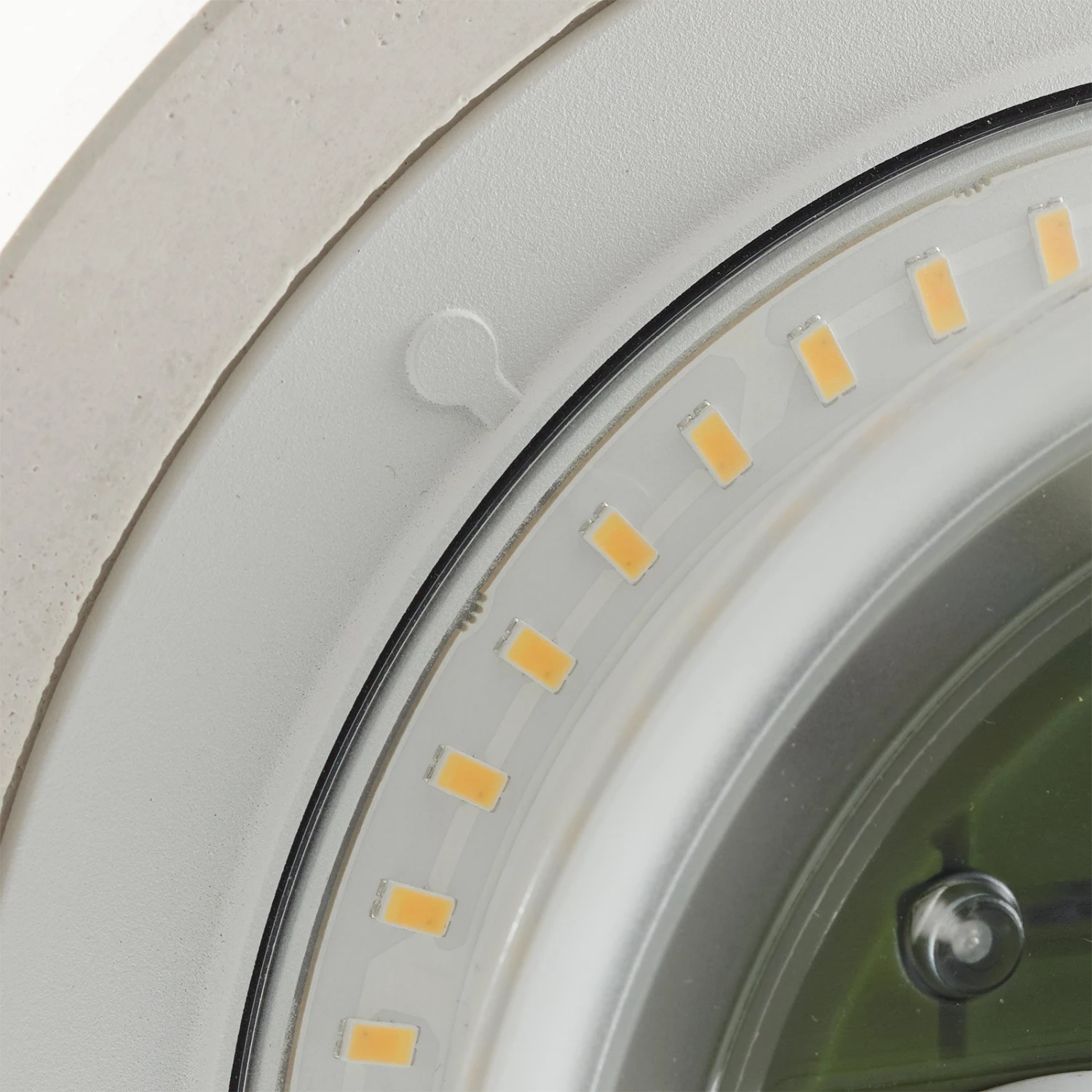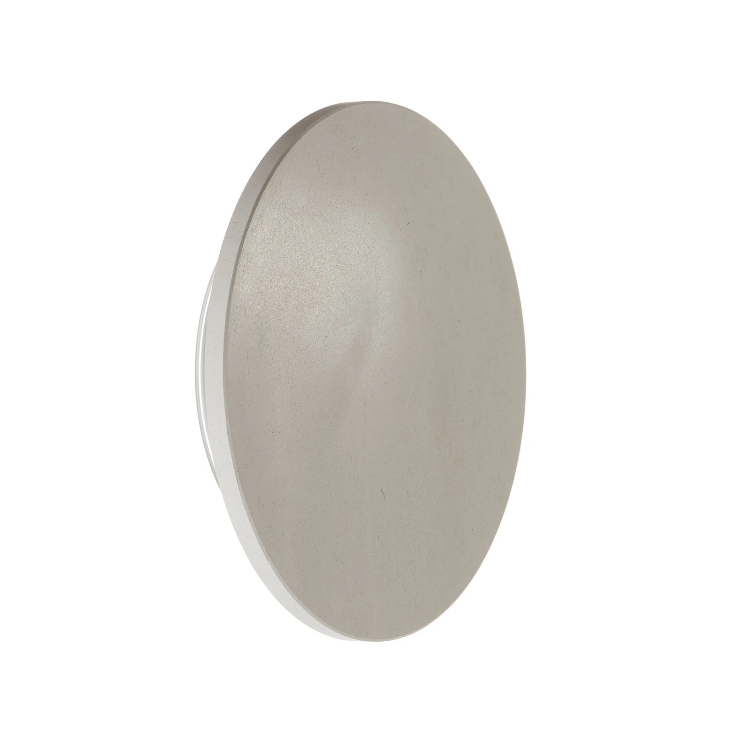 Effectively shines the light of the LED wall lamp Camouflage indirectly and creates a striking ring of light around the luminaire. Thus, the facade is uniquely set in scene. The different surfaces such as concrete, stone crema and basalt stone, where in each case a thin, round plate of the aforementioned material was glued to the round aluminum plate of the luminaire by means of an extremely durable adhesive, give the luminaire a very natural look and an extraordinary effect. There is also a choice of powder coatings in different colors and even a luminaire that has only been primed and can be painted with water-based paints according to one’s own preferences or even plastered over, achieving the greatest possible homogeneity with the facade. The powder-coated aluminum versions are sandblasted before double powder coating to ensure optimal adhesion of the paint. Then an epoxy coating ensures protection against mechanical and chemical agents and a second coating with polyester ensures the UV resistance of the luminaire and protection against weathering