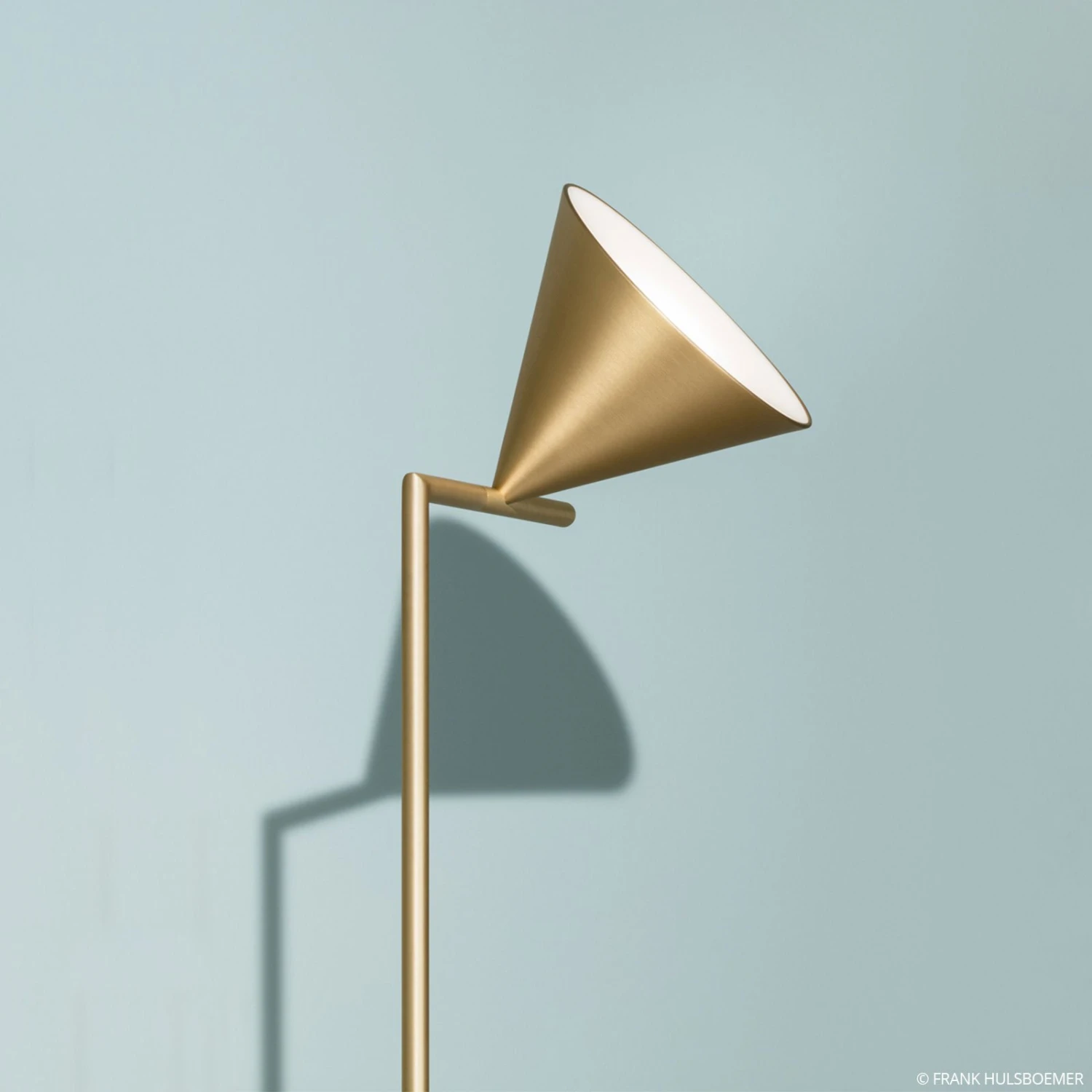 Its elegant design, which comes from Michael Anastassiades, makes the LED floor lamp Captain Flint the ideal additional light dispenser for an upscale ambience. Its cone-shaped shade as well as the frame rod are made of brushed brass, which glows warmly in the radiating light. The disc-shaped base is made of white Carrara marble and gives the filigree lamp the necessary stability. The supply cable is equipped with a pedal switch, through which the light dispenser can be switched on and off. Also the brightness can be adjusted via the foot switch from 10% to 100 instestellt.