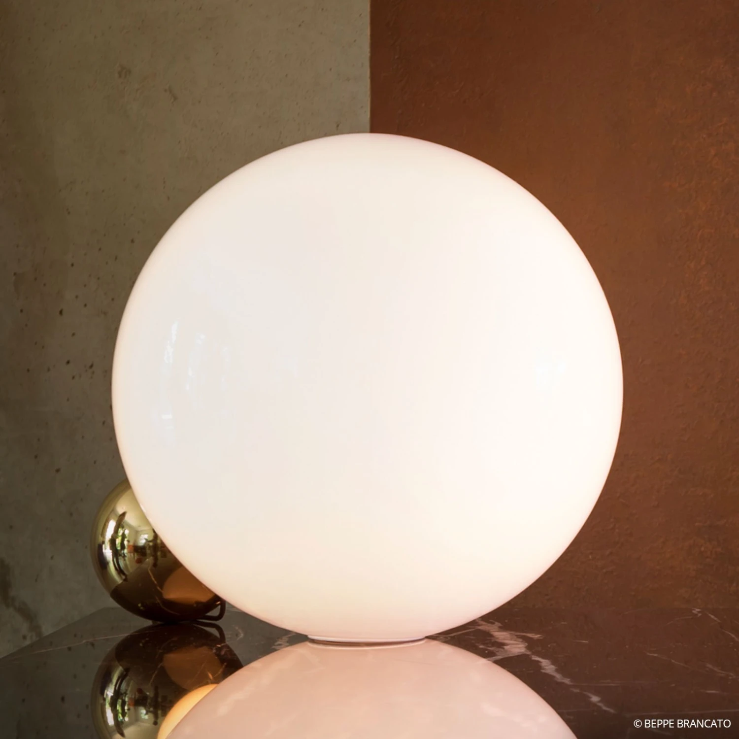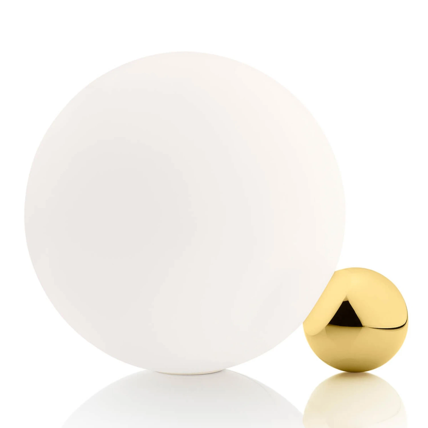 Copycat – a table lamp by designer Michael Anastassiades – consists of a large and a small sphere that touch each other. The large sphere made of blown opal glass is illuminated by the small, adjacent sphere made of 24-carat gold-plated metal, in which the LED light source is installed. This creates glare-free, homogeneous light. This makes Copycat a table lamp that is special not only in its appearance, but also in its lighting effect. A dimmer switch, which is located on the supply line, can be used to regulate the brightness of the table lamp.