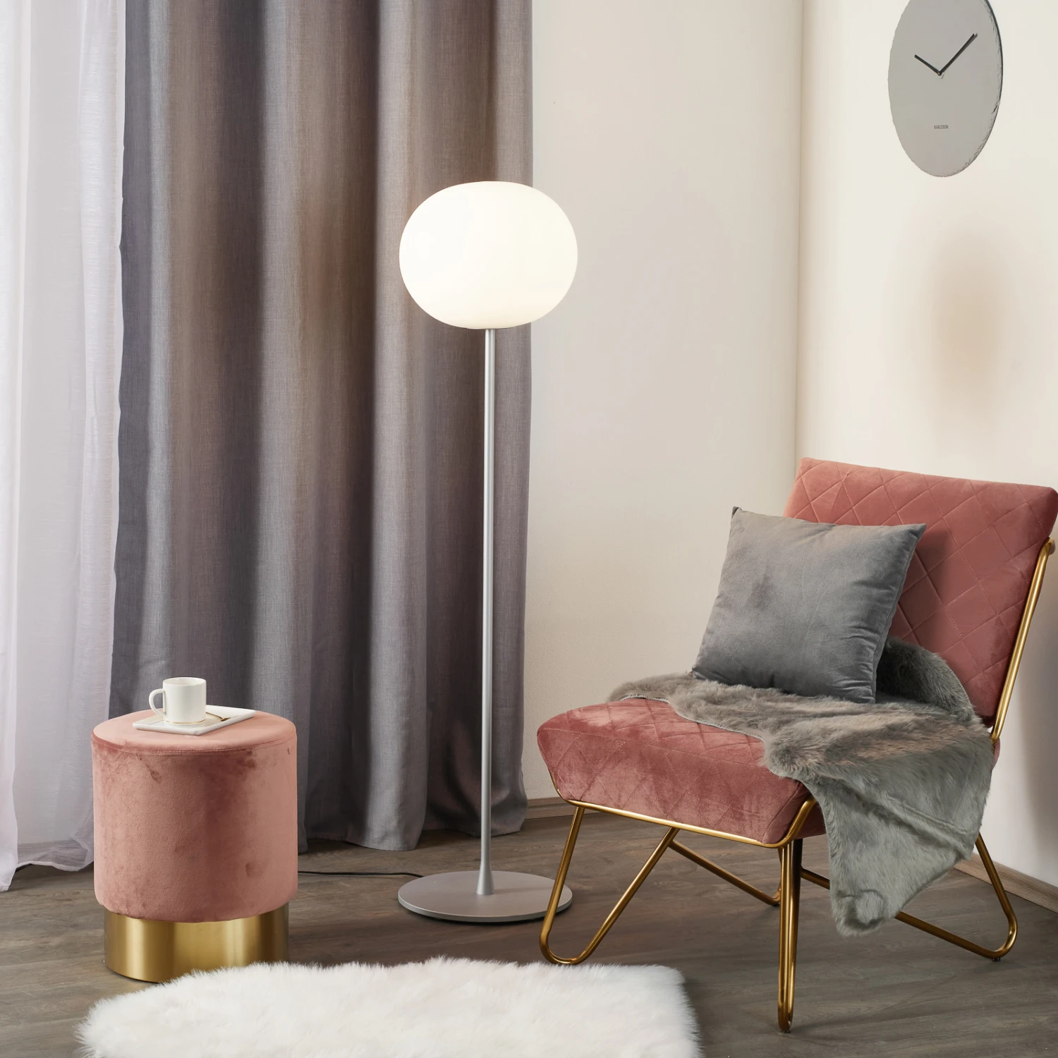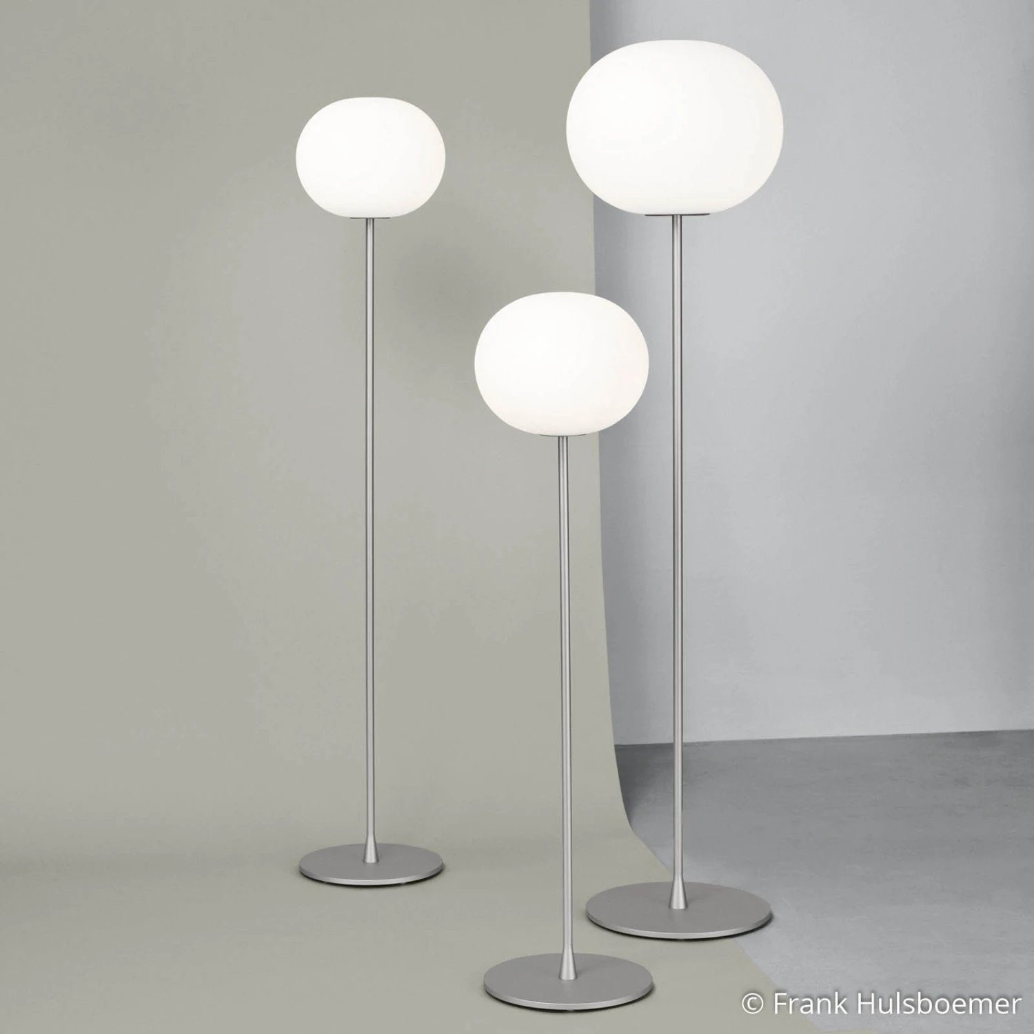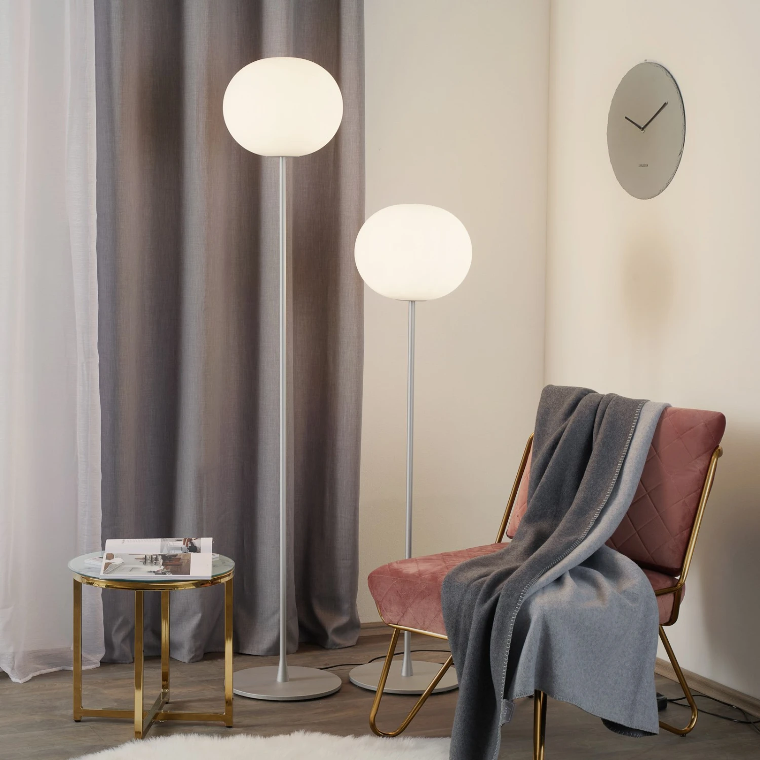 If you compare the shade of the floor lamp Glo-Ball with our earth ball, the two have something in common: they are both not completely spherical, but somewhat flattened at the “poles”, which in the case of the lamp is the certain extra. Another extra is the opal glass of the shade, which is mouth-blown and etched and due to its nature provides a particularly pleasant light.