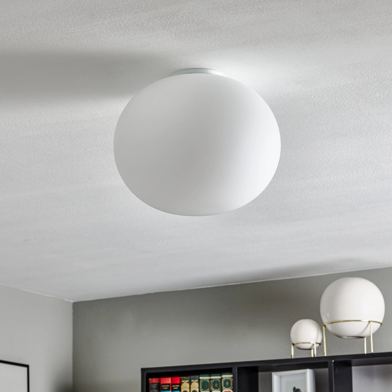 The ceiling lamp GLO-BALL provides glare-free and thus very pleasant and cozy light, which is favored by a diffuser of shuttered opal glass, mouth blown and with etched outer surface. In this regard, the classic shape makes the charm of this ceiling lamp. The white glass body favors a particularly evenly distributed lighting.