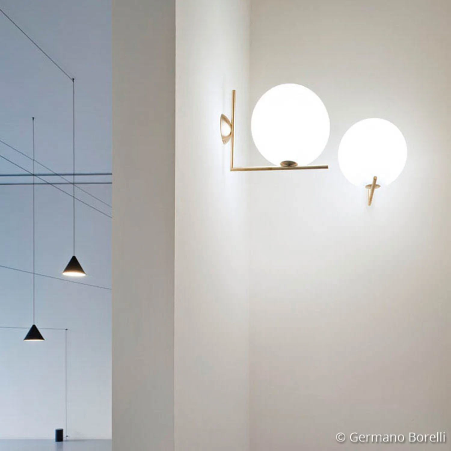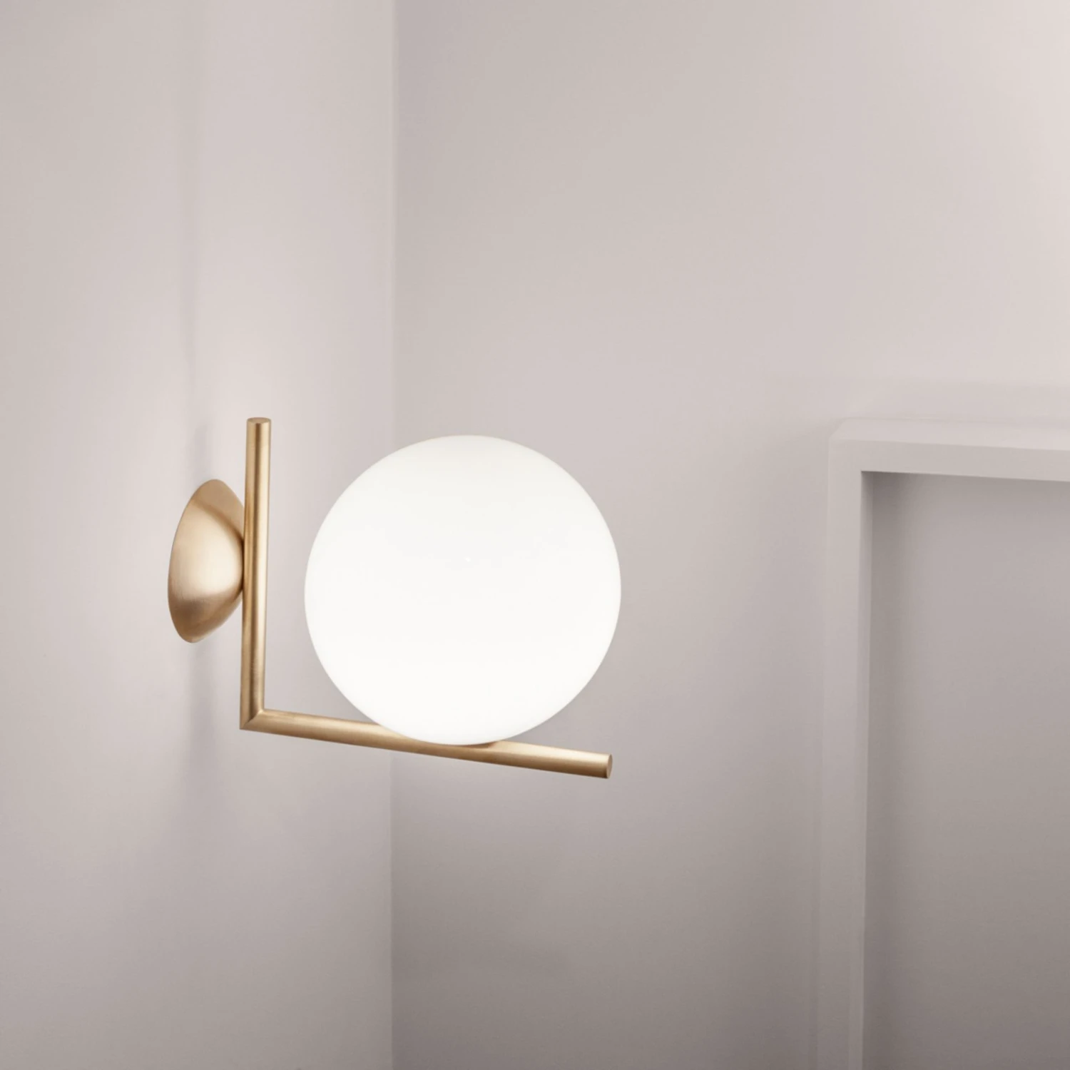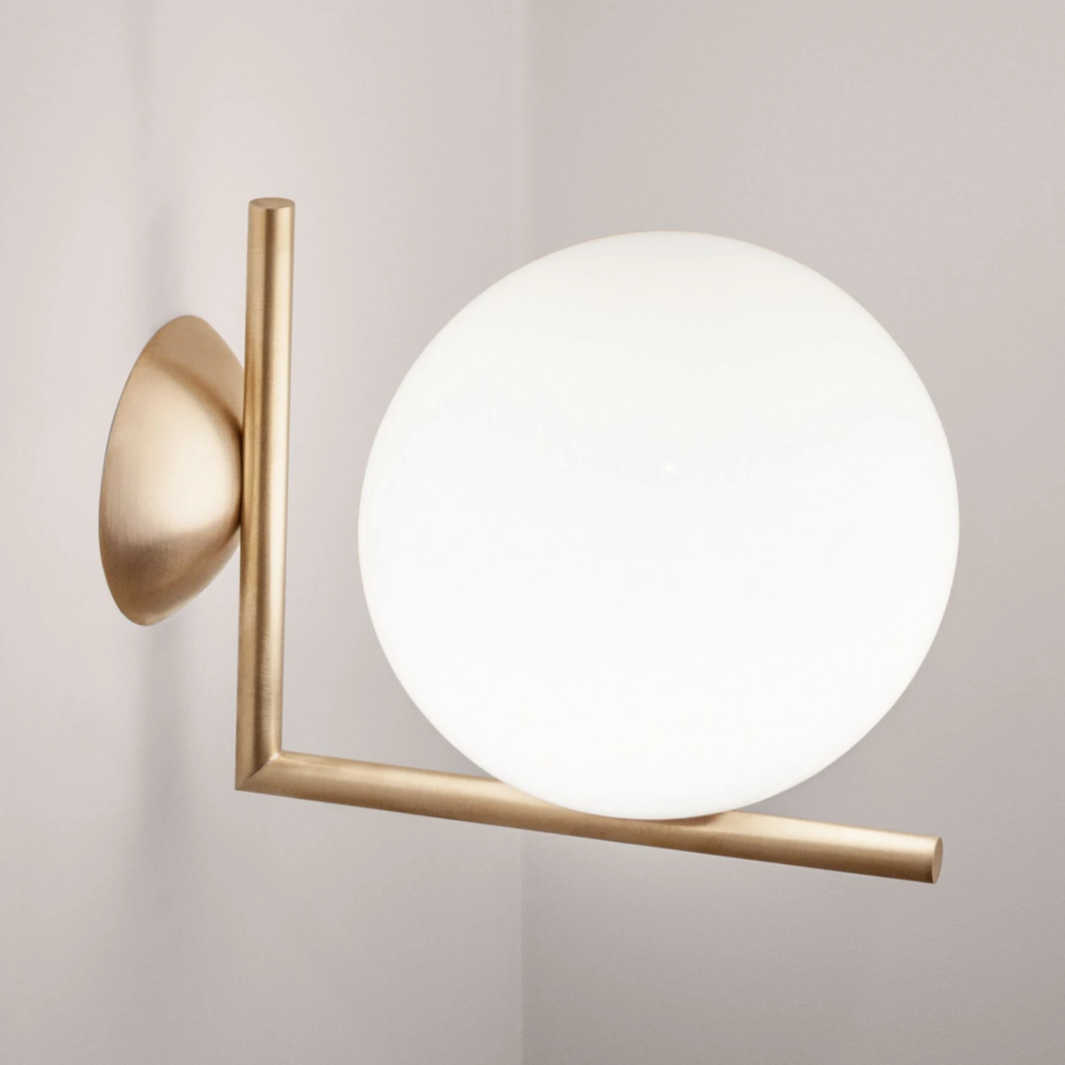 The brushed brass wall bracket paired with the white glass lampshade in the shape of a sphere creates a harmonious image of a classic wall lamp. Soft, glare-free light provides IC C/W1 by the nature of the glass, which, among other things, also ensures an even distribution of light. The sphere seems to hang from the fixture as if on a silken thread – a design feature that immediately turns the wall lamp into a noble designer piece.