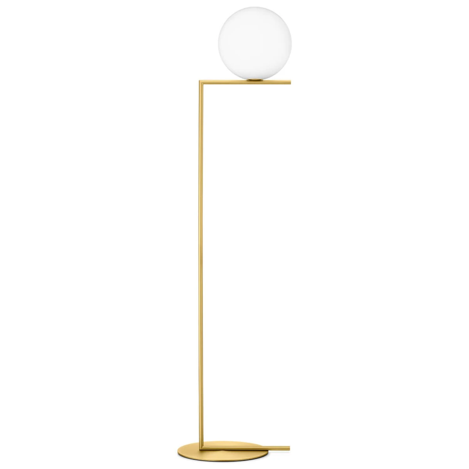 As if the glass ball would float on the thin rod, this is how the designer floor lamp IC F2 by FLOS designer Michael Anastassiades presents itself. Given the idea for this luminaire by a juggler, Anastassiades has designed a lighting object that is all about demonstrating balance. Just as the juggler runs balls up and down his arms without them falling, the spherical glass lampshade of this floor lamp is on an arm on which it seems to float, holding the balance.