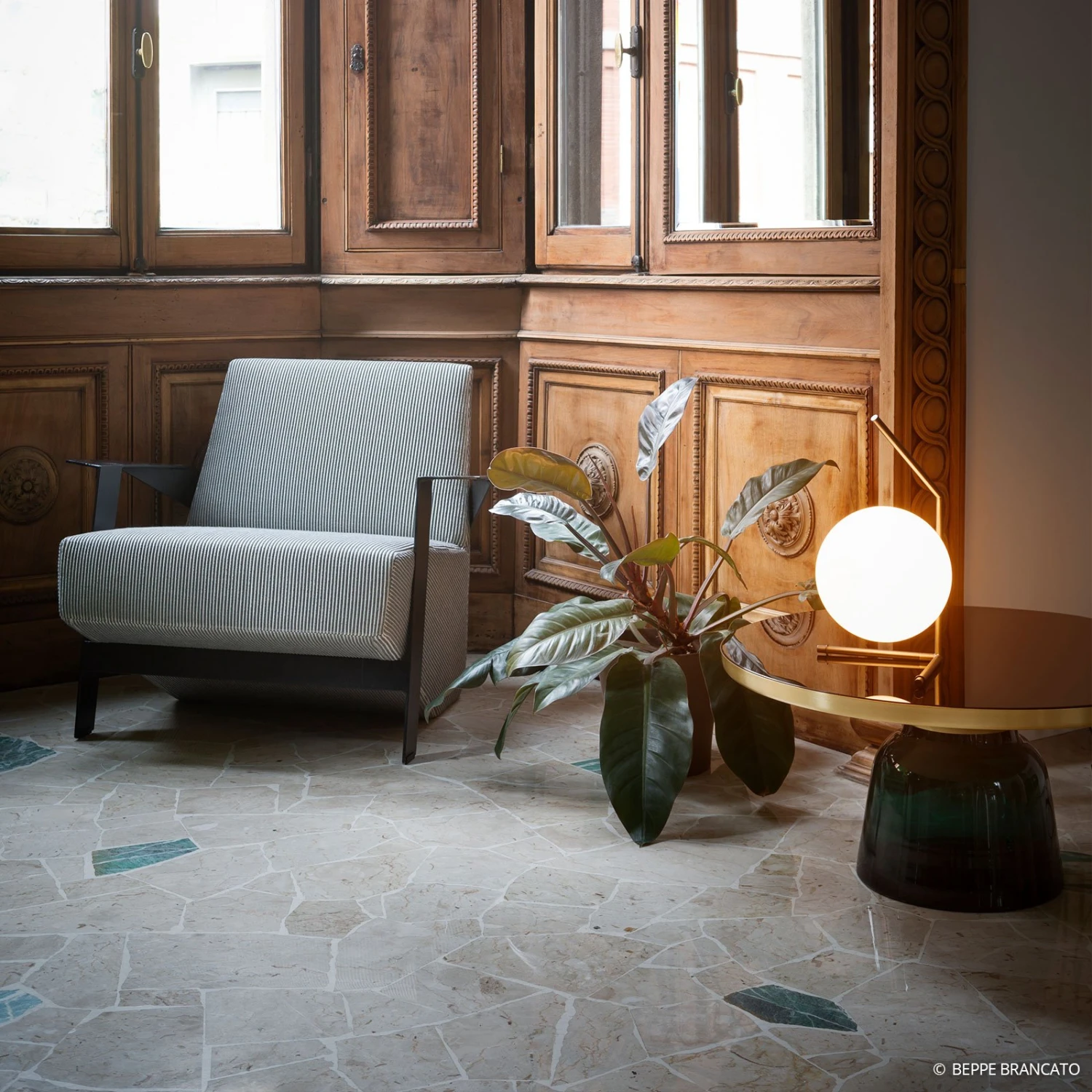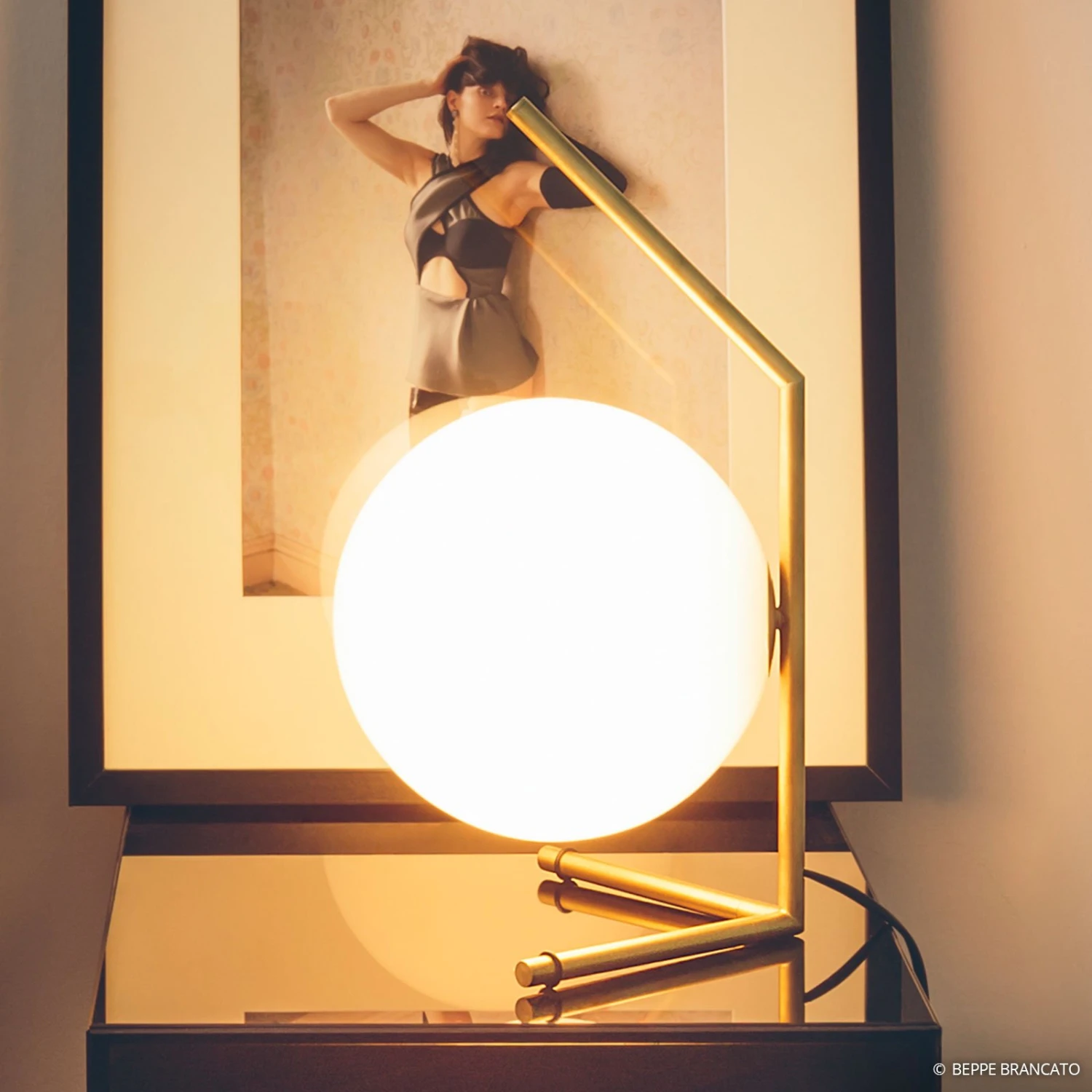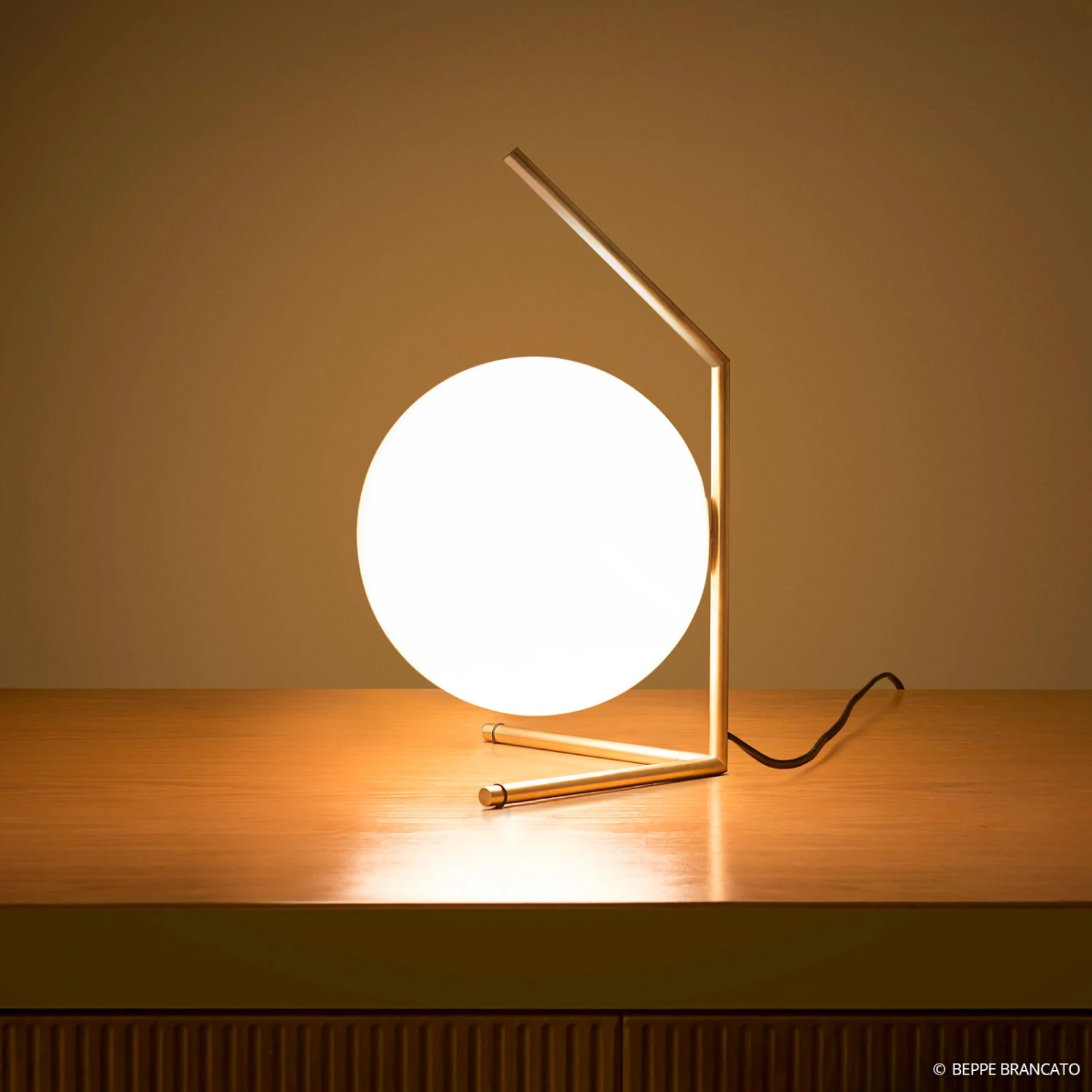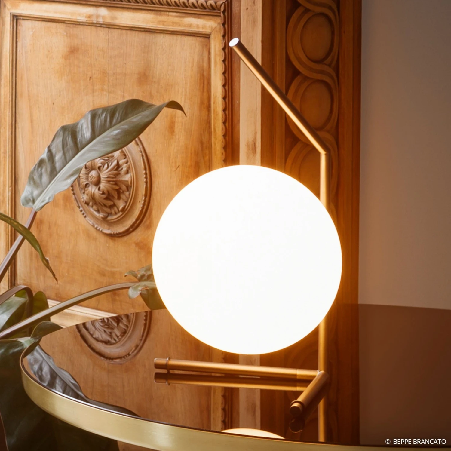 Glass sphere and brass rod in perfect symbiosis in the table lamp IC T1 by FLOS
