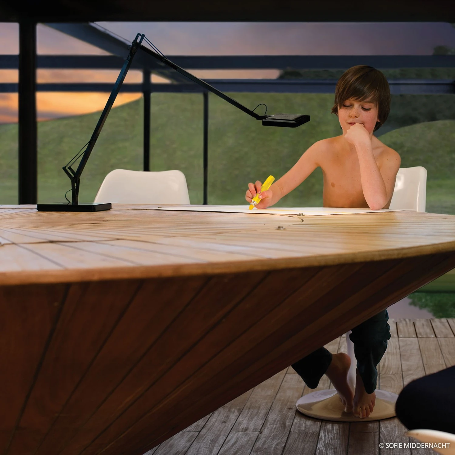 Energy efficiency and innovative operation meet a clearly reduced design: the LED table lamp Kelvin is not only a functional light source at the workplace, but also a fashionable alternative in the living area, for example as a reading light. The double pantograph arm and adjustable head guarantee a high degree of flexibility. Particularly practical is the electronic on/off switch on the top of the reflector head – through this, the LED table lamp can be conveniently operated. In addition, the lamp is equipped with a Green Mode switch, which allows the lamp to save even more energy through daylight-dependent regulation.