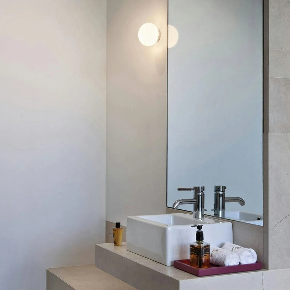 Wall and ceiling lamp Mini Glo-Ball by Jasper Morrison for Italian Flos is based on a simple concept to create the maximum spread of light using an elegant little globe of hand-blown opal glass. When you turn on the luminaire, a brilliant disc will appear like a moon.