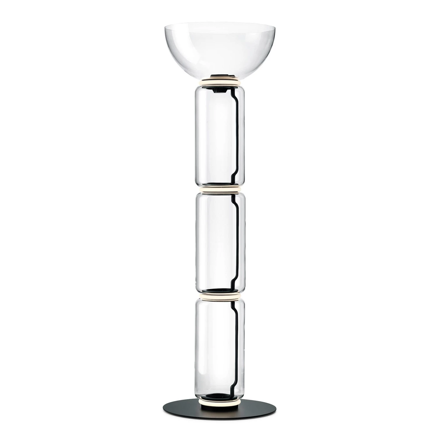 The three cylindrical glass elements of the floor lamp are mouth-blown and designed transparent. On top sits a likewise mouth-blown, hemispherical glass bowl, which provides a great finish and at the same time scatters the light upwards like a floodlight. The floor lamp is completed by a 200 cm long power cord, on which a pedal switch for switching on and off, as well as for dimming from ten percent to 100 percent and vice versa is installed.