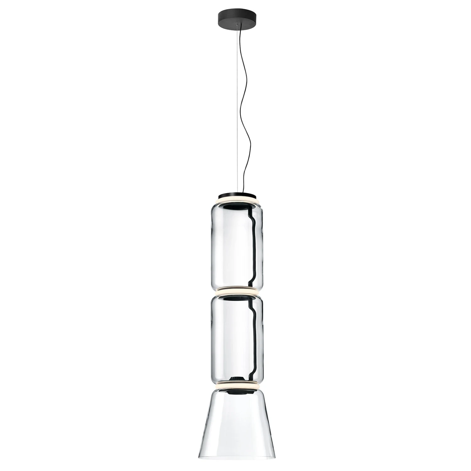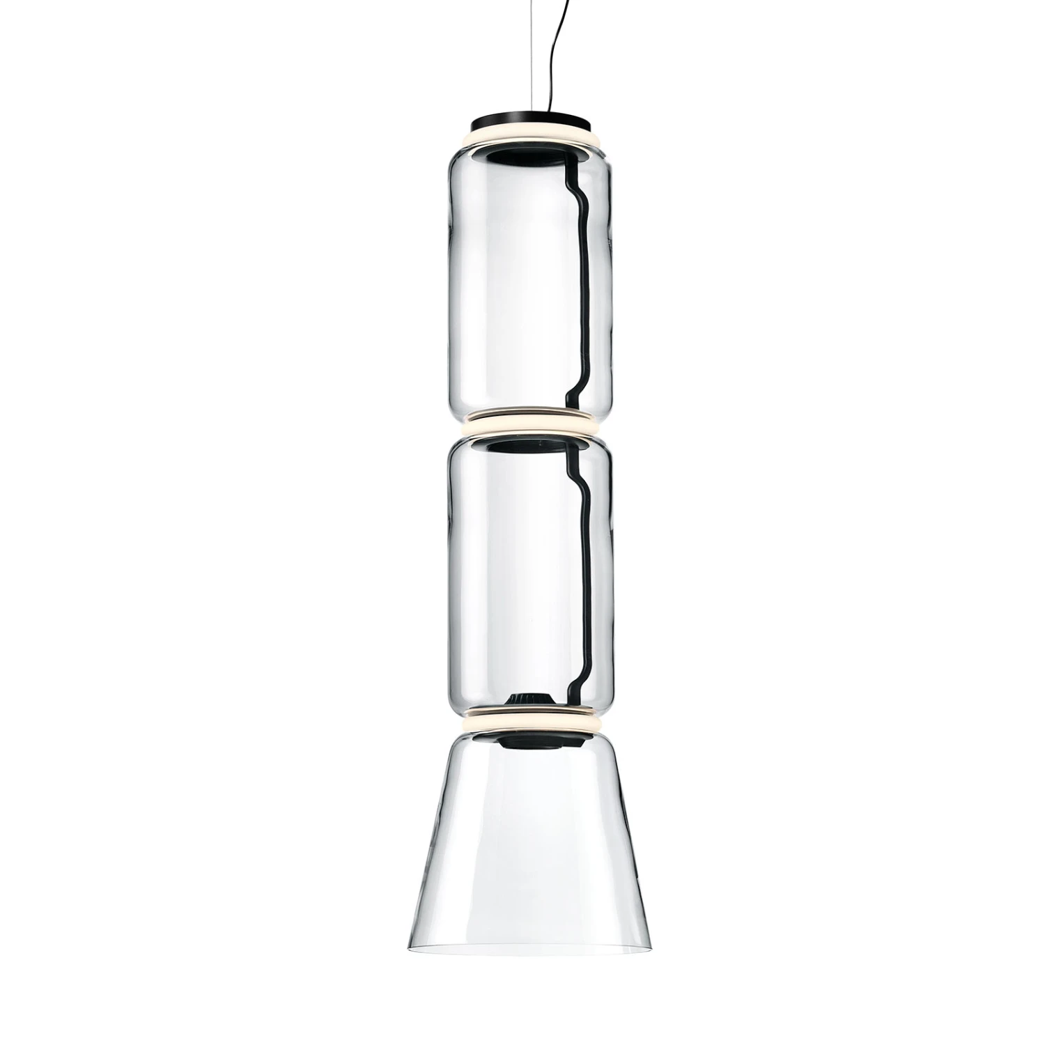 The individual glass blocks are hand-blown and designed to be transparent. The base of the pendant lamp is formed by cylindrical glasses, which are complemented at the bottom by a cone-shaped glass element. The result is a modern light object that merges with excellently calibrated LED lighting. When switched on, the pendant lamp emits warm white light into the room and thus skillfully sets accents. Both in living areas and in spacious entrance areas Noctambule comes into its own very well. The use in hotel and restaurant areas can achieve equally impressive lighting.