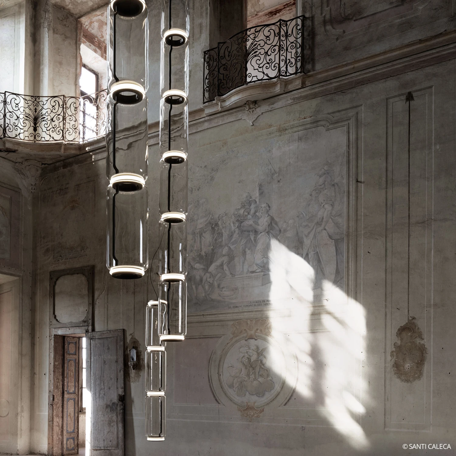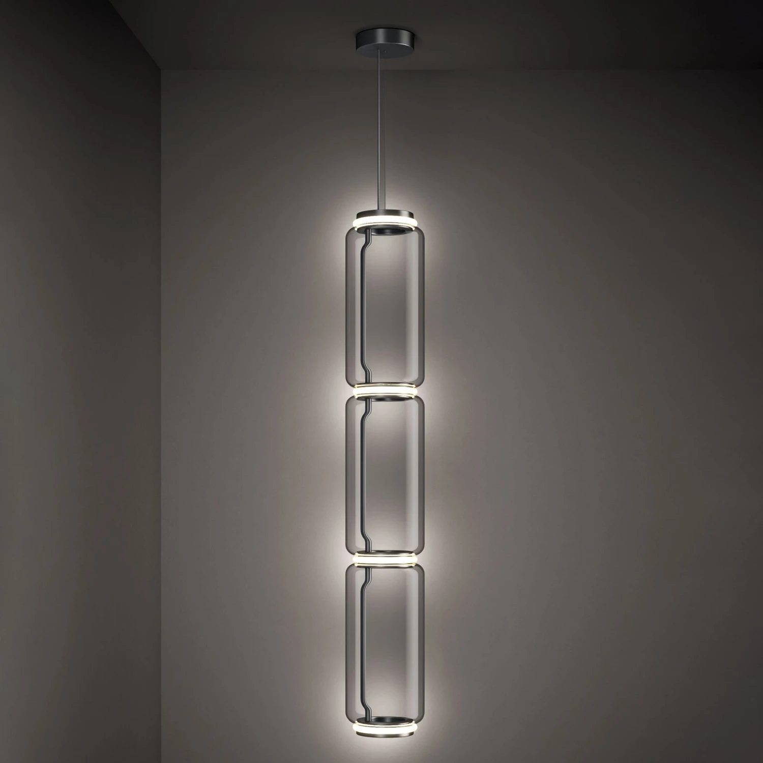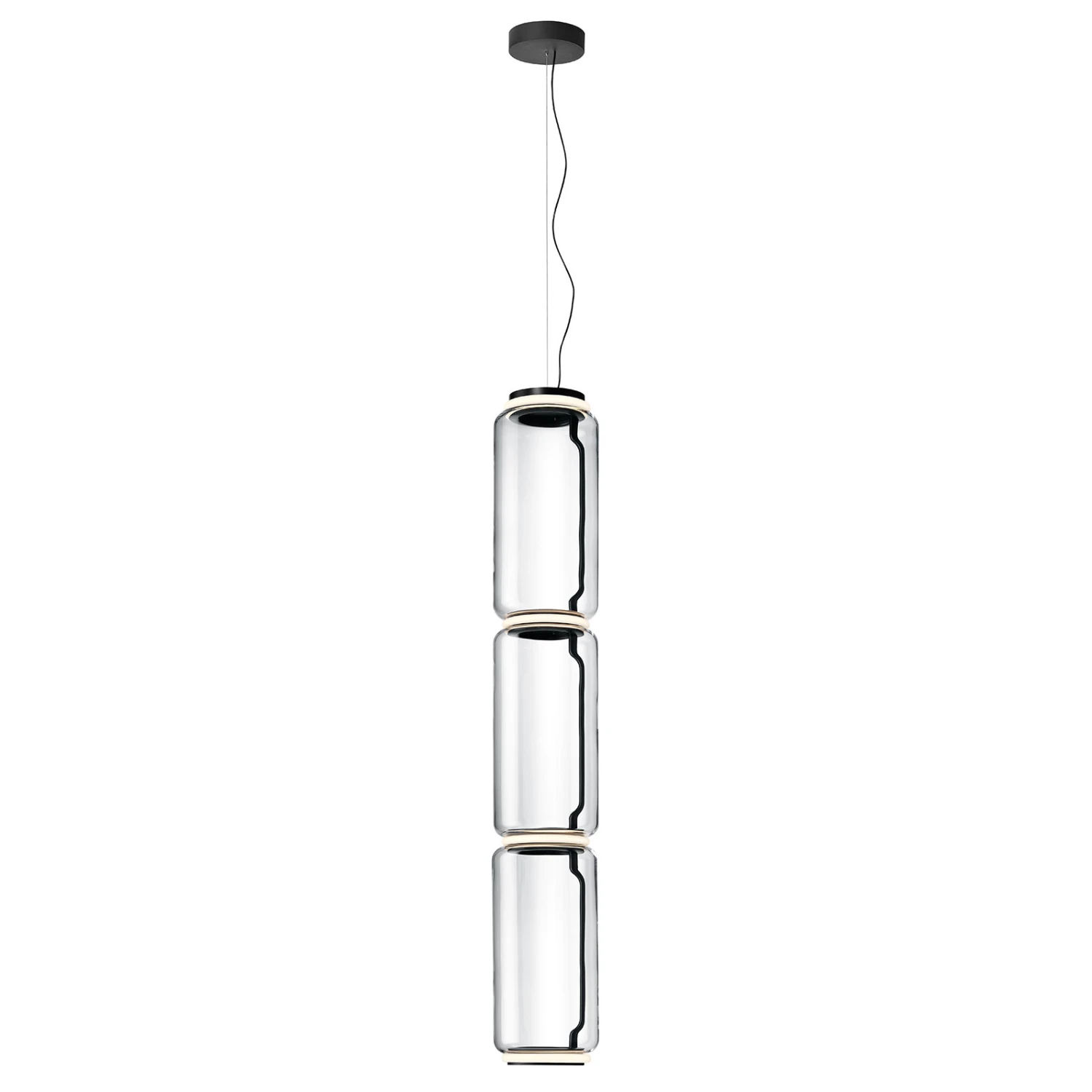 The designer Konstantin Grcic has designed the LED pendant lamp Noctambule in cooperation with the Italian lighting manufacturer Flos and places individual, cylindrical glass elements made of mouth-blown, transparent glass on top of each other. The glass construct is interrupted by narrow, ring-shaped silicone diffusers in opal white color, under which the excellently calibrated LED lighting is hidden. The transparent design makes Noctambule look rather inconspicuous and integrates perfectly into the room. Not only in private living rooms and high entrance areas, but also in the hotel ambience, the pendant luminaire can shine in its entirety and enchant every observer.