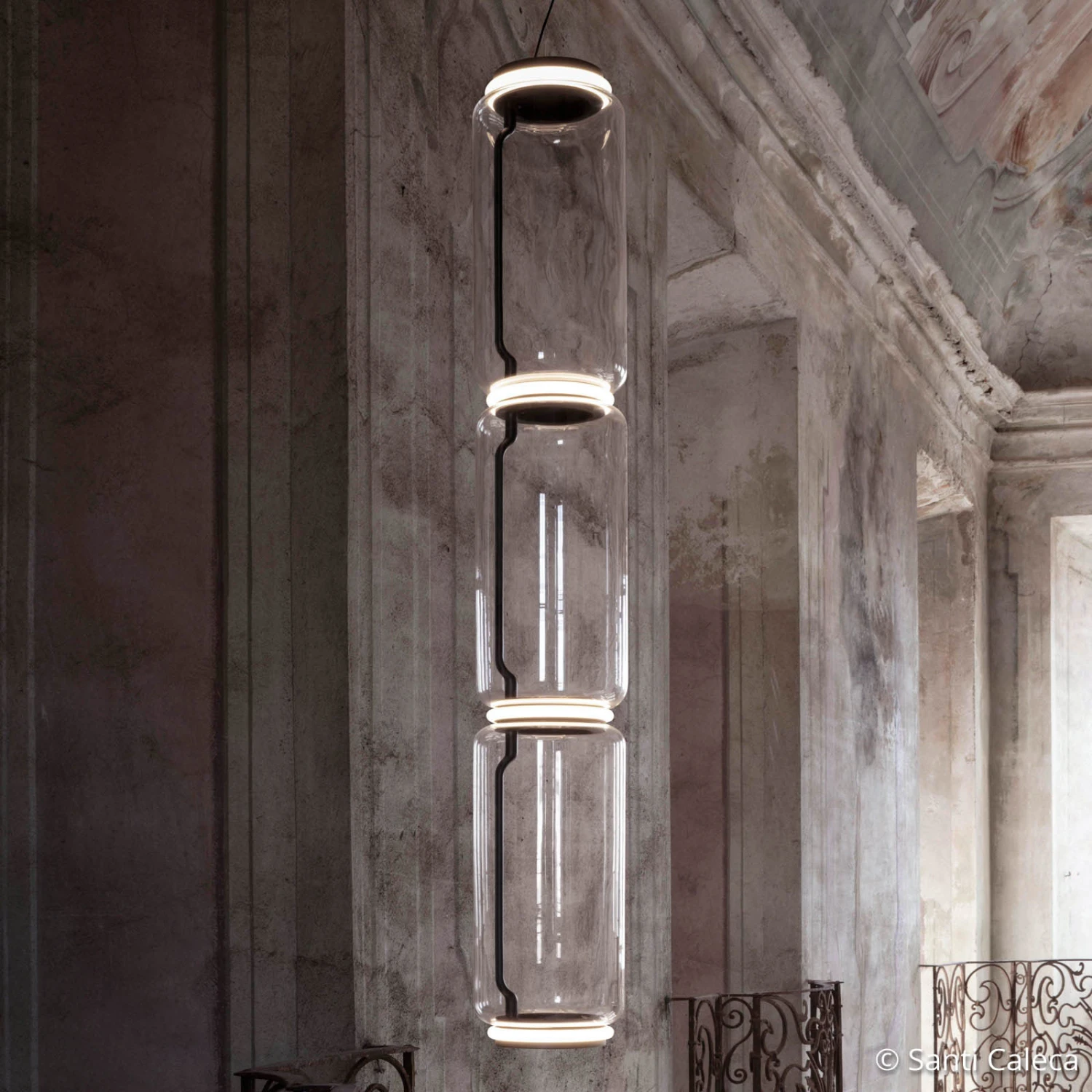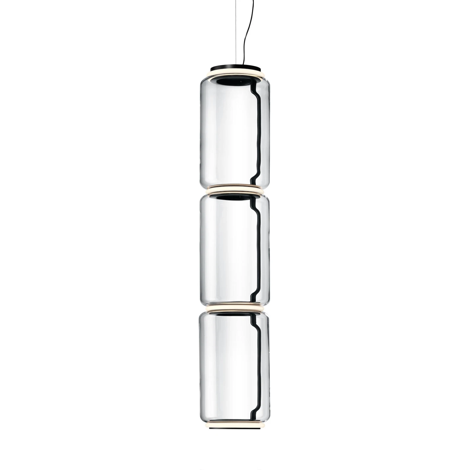 The term Noctambule means a night owl or a night owl and is perfectly interpreted by the LED pendant lamp designed by designer Konstantin Grcic. The individual, cylindrical glass elements are made of mouth-blown, transparent glass and are only interrupted by the narrow, ring-shaped silicone diffusers in opal white color.