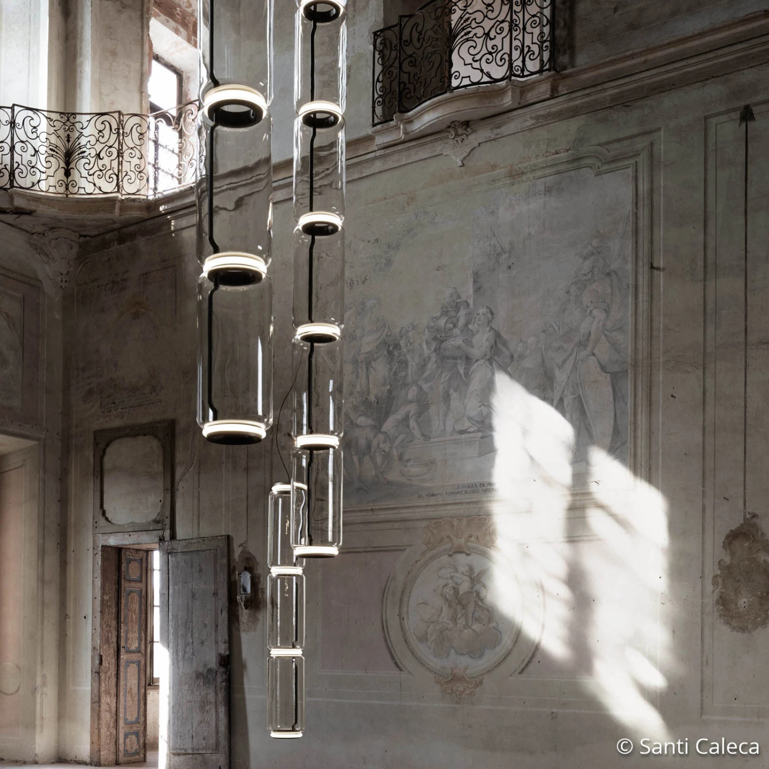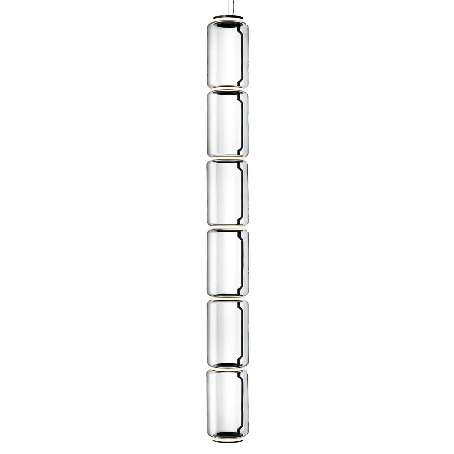 The term Noctambule means a night owl or a night owl and is perfectly interpreted by the LED pendant lamp designed by designer Konstantin Grcic. The individual, cylindrical glass elements are made of mouth-blown, transparent glass and are only interrupted by the narrow, ring-shaped silicone diffusers in opal white color.