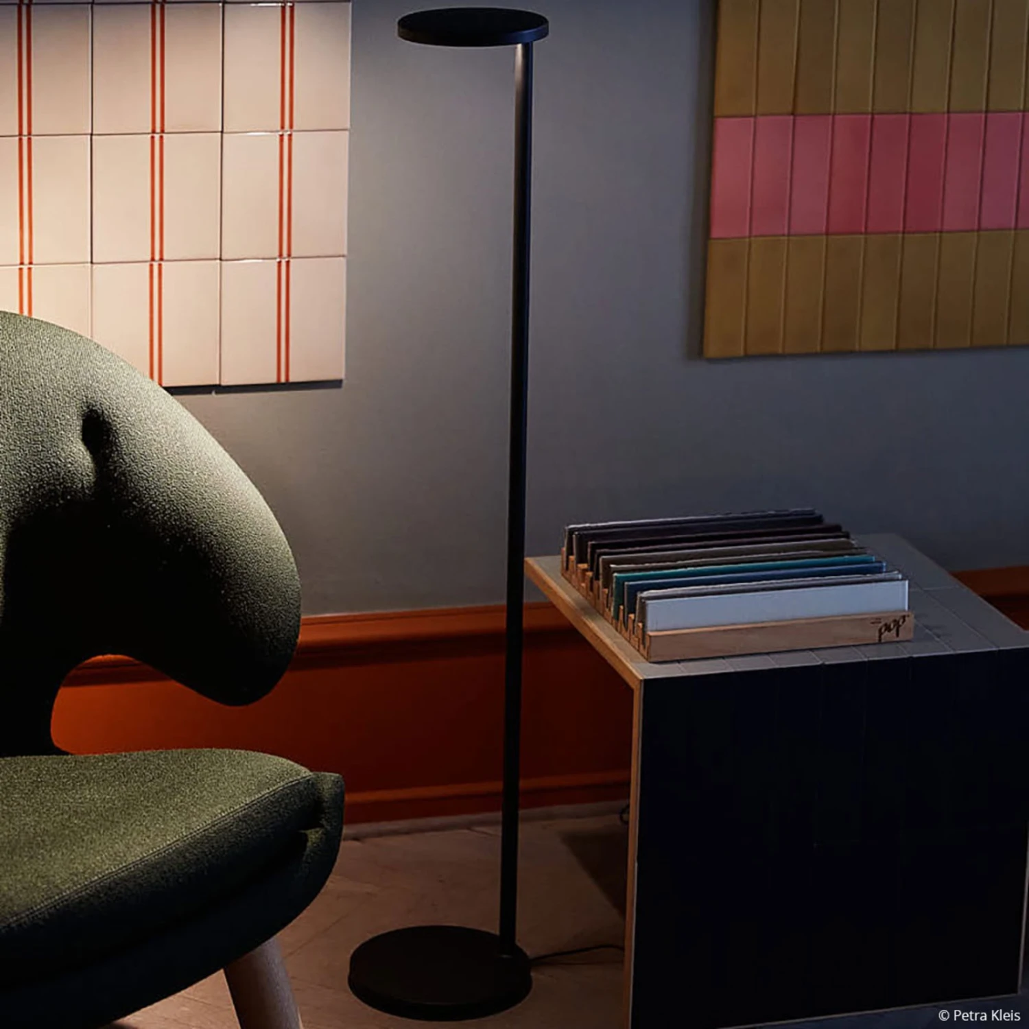 Slim LED floor lamp Oblique Floor with warm white illumination The LED floor lamp Oblique Floor consists of a round base and a shade, which is also round. The two elements are connected by a narrow, tubular frame. The discreet and uniform color design creates a harmonious overall appearance, so Oblique Floor can be easily integrated into different environments. For example, it is suitable as a light source for the living area or the study. There, the luminaire with its warm light provides a pleasant atmosphere. The brightness can be regulated quickly and easily with the integrated dimmer switch on the shade of the lamp. The innovative, patented lens creates an asymmetrical light distribution that guarantees high visual comfort.