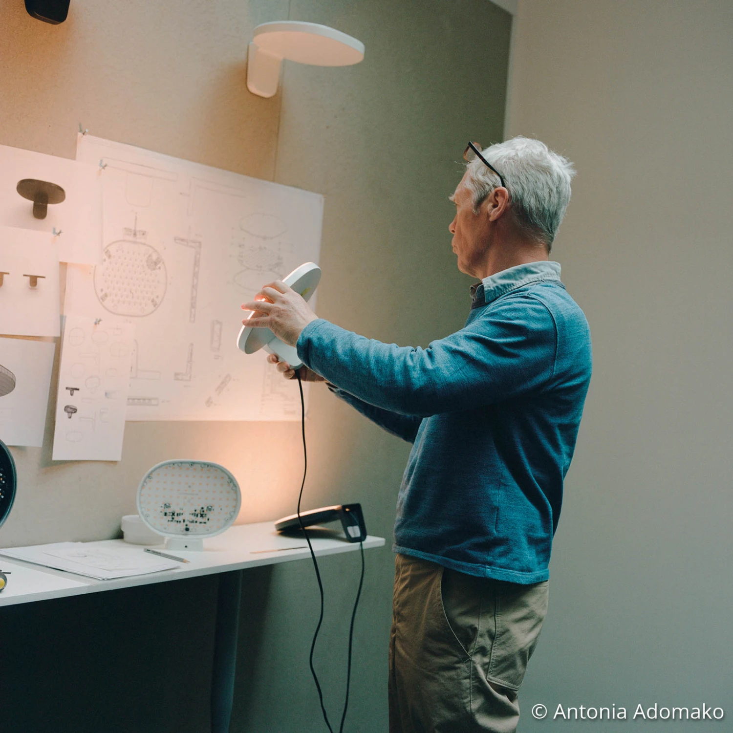 Oplight was designed by English product and furniture designer Jasper Morrison and produced by the renowned Italian lighting manufacturer FLOS. Jasper Morrison was born in London in 1959. After completing his design studies, he founded the Office for Design in London in 1986 and became known for various installations, exhibitions and projects. Since 2001 he has been Royal Designer for Industry and now has offices in London, Tokyo and Paris. With Oplight developed a universal luminaire for private and public use.