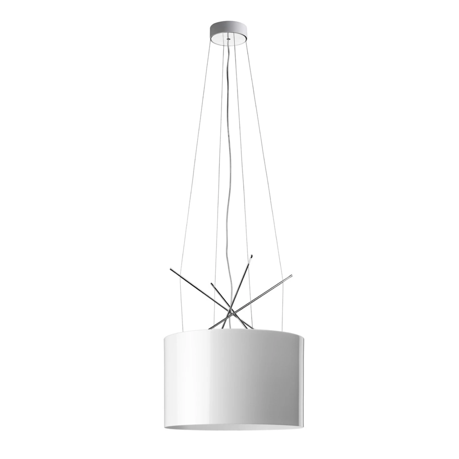 The pendant lamp Ray S, designed by Rodolfo Dordoni, essentially does without special details: The shade consists of a cylindrical glass or aluminum ring, only the crossed metal struts above the shade represent a certain feature. A timelessly beautiful hanging lamp, which makes a first-class figure in modern living rooms with its restrained, reduced to the essentials look. With a diameter of 43 cm, Ray S can be mounted above a table or hang freely in the room – think hallway and bedroom.