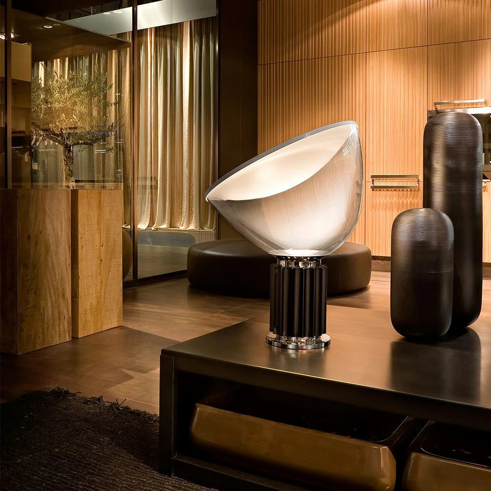 The material is PMMA plastic and polished aluminium. The lampshade has a matte finish on the inside and a glossy finish on the outside. The shape of the lampshade makes the light reflect as an arc and provides a soft and wonderful light.